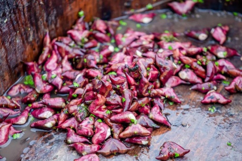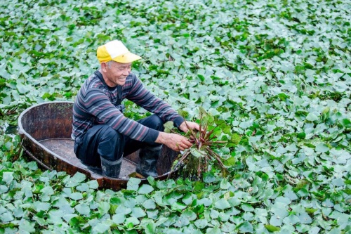 现下正是吃菱的好时节。密密麻麻的菱叶铺满整个池塘菱池,岛民们乘坐特制的菱桶,双手左右划着,在水中采收鲜嫩的菱角。剥开后的菱角,形如美玉,味道爽脆。由菱角做成的菜品也透着淡淡的秋味。
