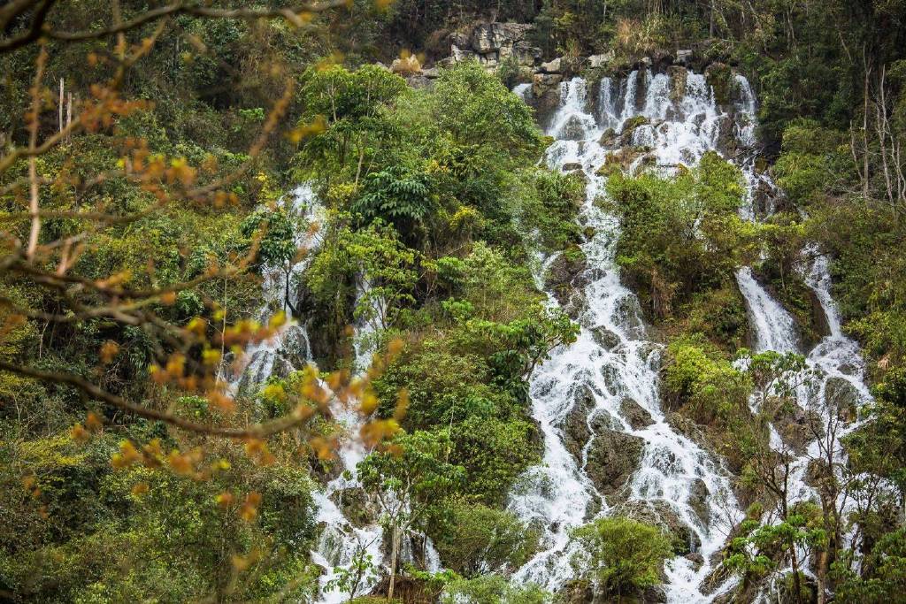 林木苍翠欲滴,郁郁葱葱,翠谷瀑布浪花飞溅,潺潺而下,和黄果树、德天瀑布的雄伟壮观相比,蜿蜒而下的翠谷瀑布少了几分咄咄逼人的气势,多了几分灵动和妩媚。