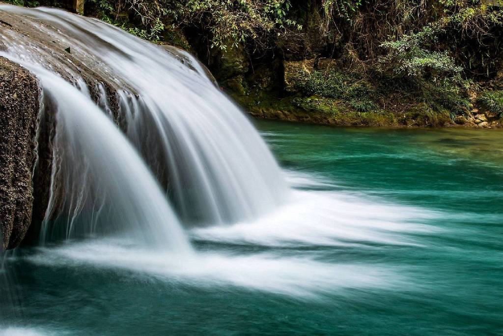 急速而下的瀑布汇入深潭,潭水绿如碧玉,茂盛的植被将其包围,仿佛是在藏匿着这块绝世美玉。