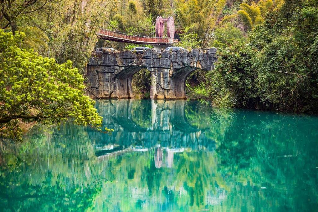小七孔桥附近的水怕是被施过了魔法,水面平静得不起一丝波澜,树木深深浅浅倒映其中,让人一时分不清是倒影还是在水下也有一个真实存在的水中森林。