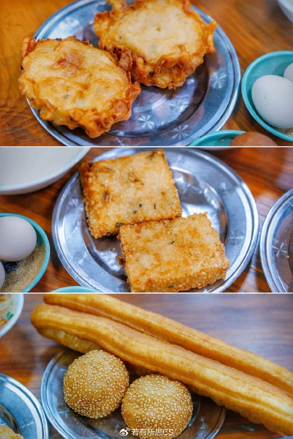 炸的金黄酥脆的糍饭糕,带着紫菜虾皮的豆腐脑。。。吃一口,满是记忆里的口感。