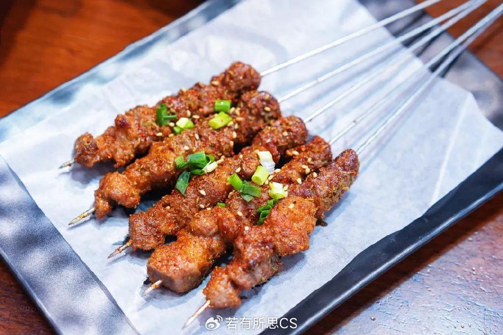 烤羊肉串肥瘦相间,配上芝麻香气四溢。