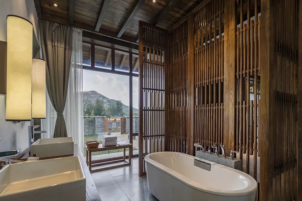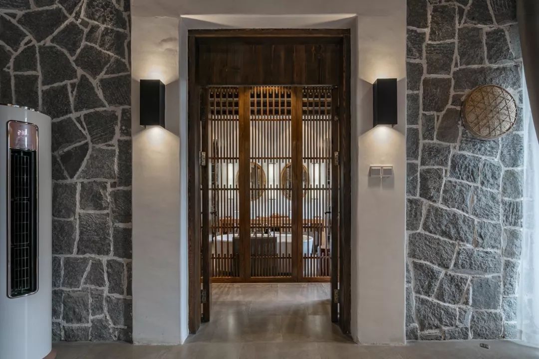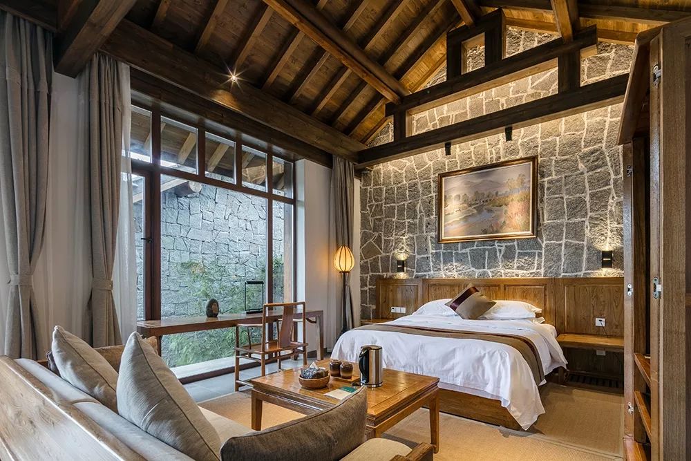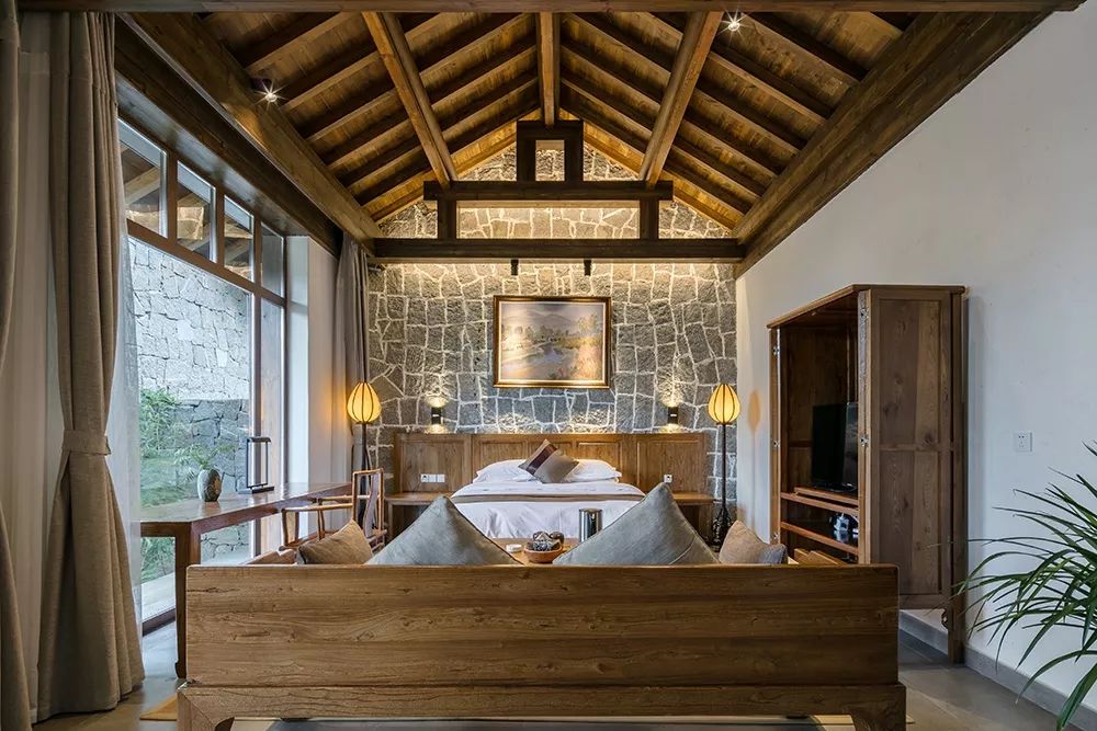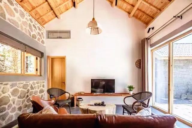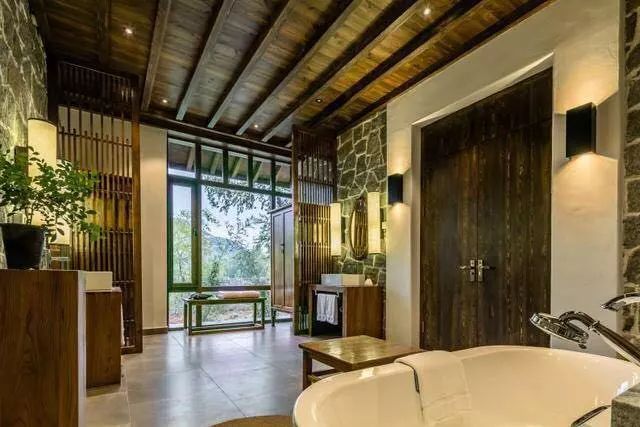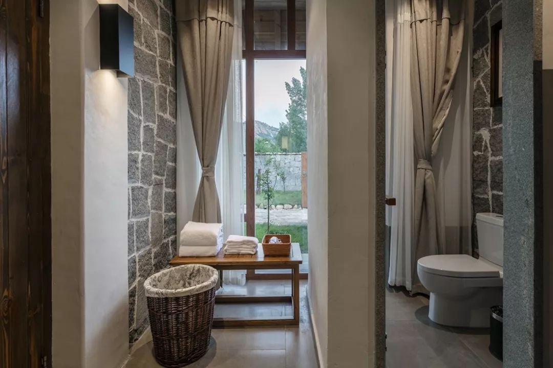 传统的石头房子,在改造后,粗犷而不乏精致,老榆木家具,老匠人手工打造,每个房间的用水都是经过过滤的山泉水,可以直接饮用,用山泉水泡个澡,在科勒的浴缸里,这大概是盛夏最为惬意的享受了吧。