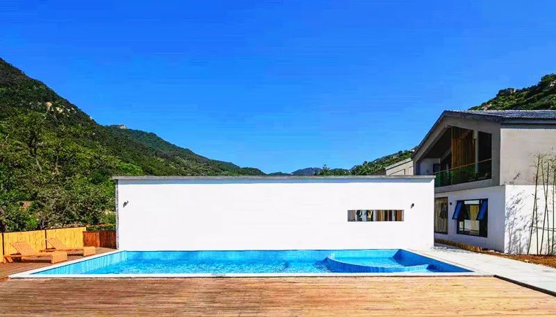 富泉山居民宿坐落在千年古村落池家寨村,是利用富泉村池家寨老村原有 22户老宅基地,打造出的包括34个客房、公区1000 平方米的区域核心高端民宿。山居整体建筑设计思想以回归为主,通过保留原始的老宅形态,加建透明玻璃窗,配上宅前的露天泳池,巧妙地将现代和传统融合起来。