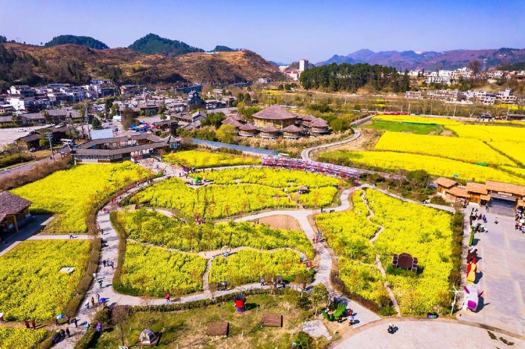 可见蔚蓝天空下起伏连绵的山,可见布依族村落特有的青瓦房、封火墙,可见灿如金毯的油菜花田,春天万物的勃勃生机尽在其中。