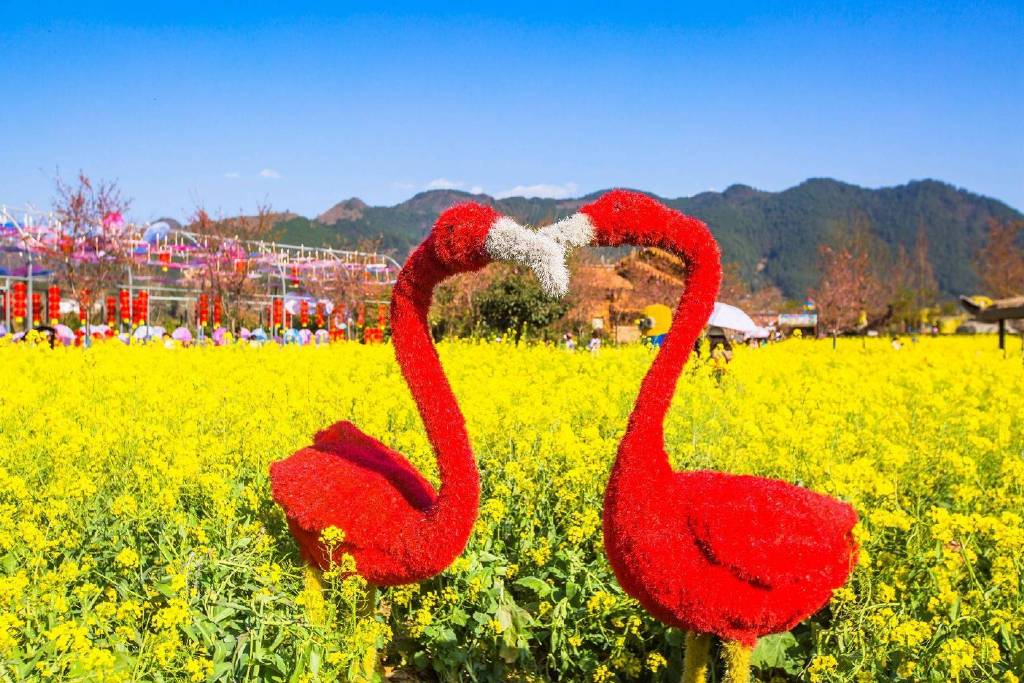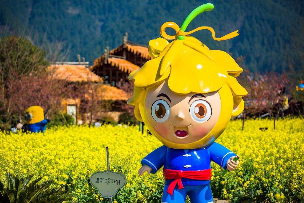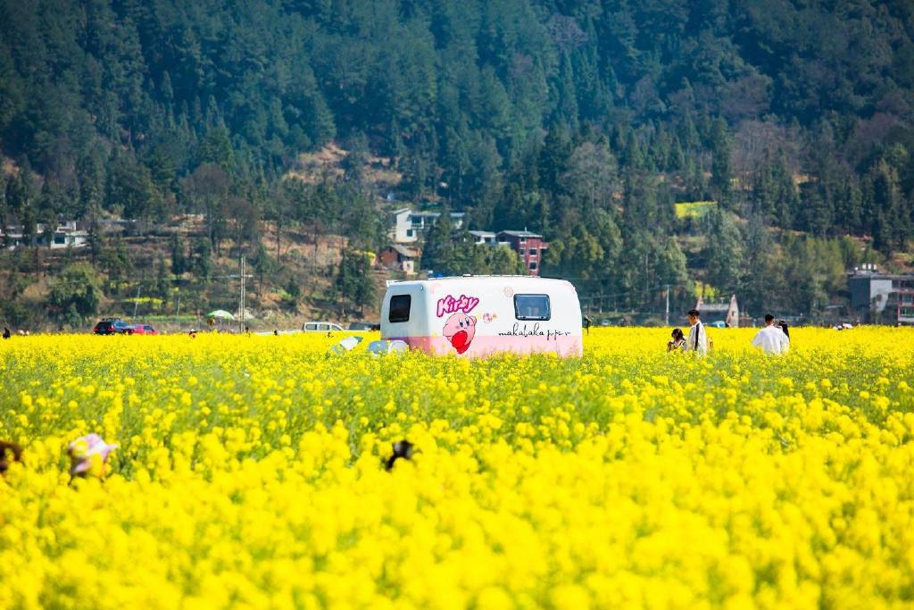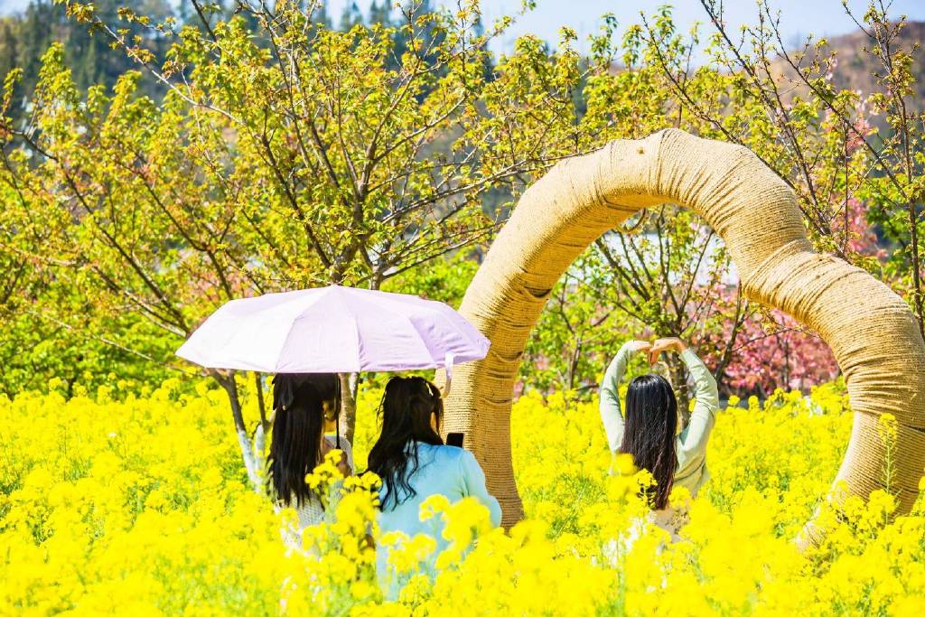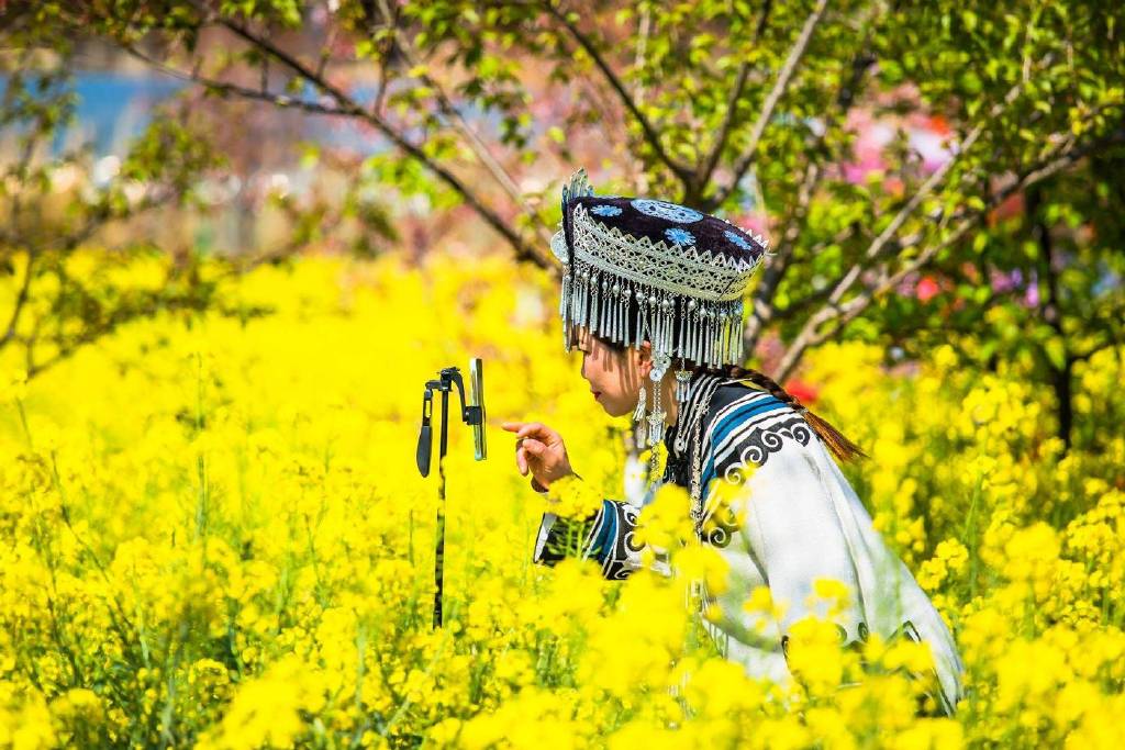 此时盛开的繁花中,最灿烂的是油菜花,而在花海中漫步的人们,最亮眼的则是身着少数民族的小姐姐。景区所在村落是当地保存完整的民族文化村落,内辖音寨、洛海、竹林堡、麦董等诸多自然村寨,随处都能感受到浓郁的少数民族风情。