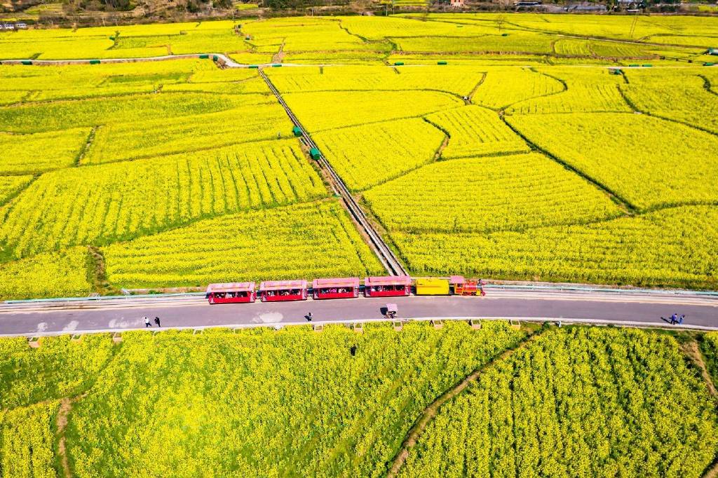 乘坐小花车沿着花海前行,一望无际的油菜花海,放眼望去,满目金黄,绘成一幅炫目的乡村田园油画,让人感觉到盎然的春。