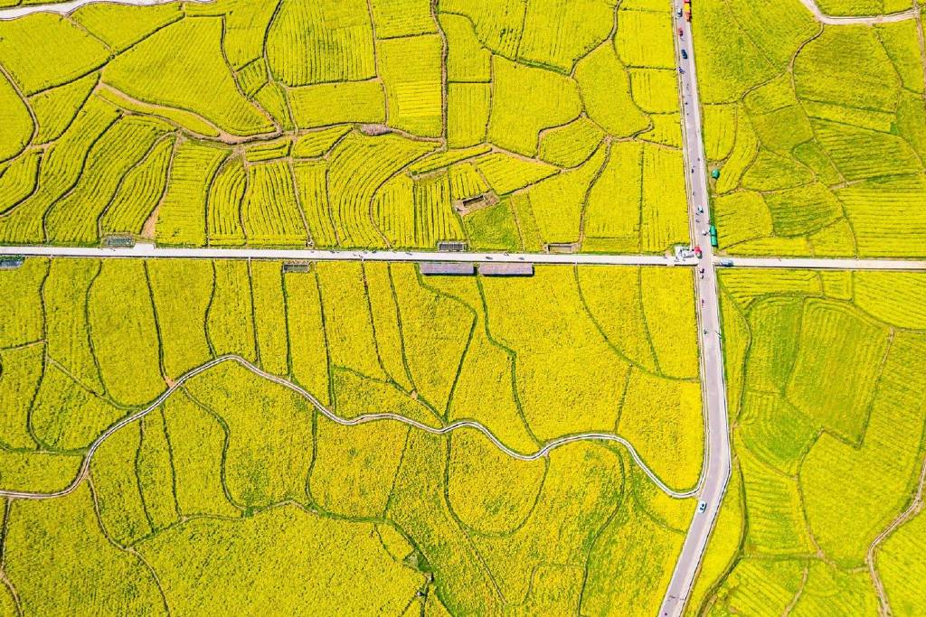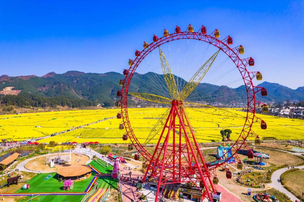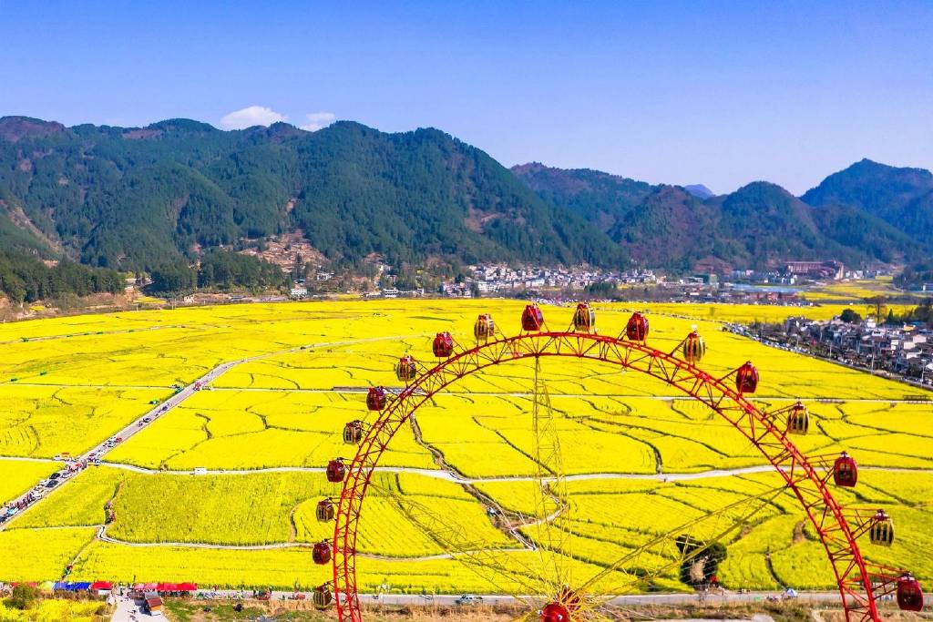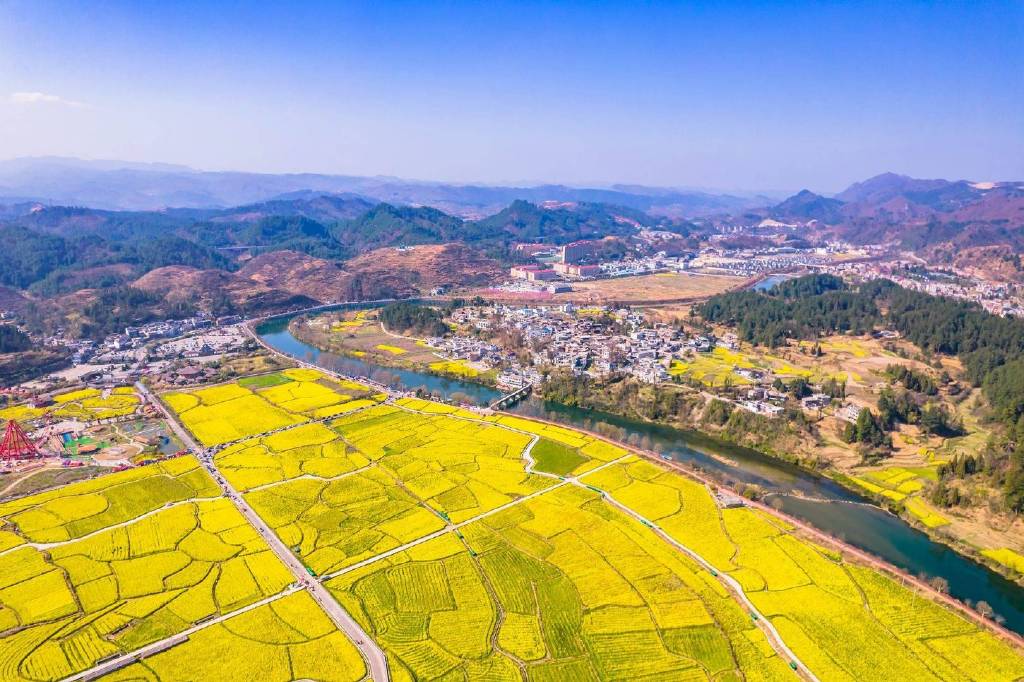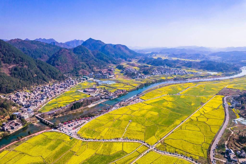 从高空俯瞰,群山、花海、林木和丝带般缠绕的碧水如一幅浓墨重彩的风景油画,大自然的活力和人们融入自然的快乐喷薄欲出。