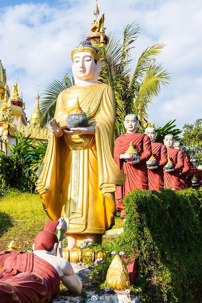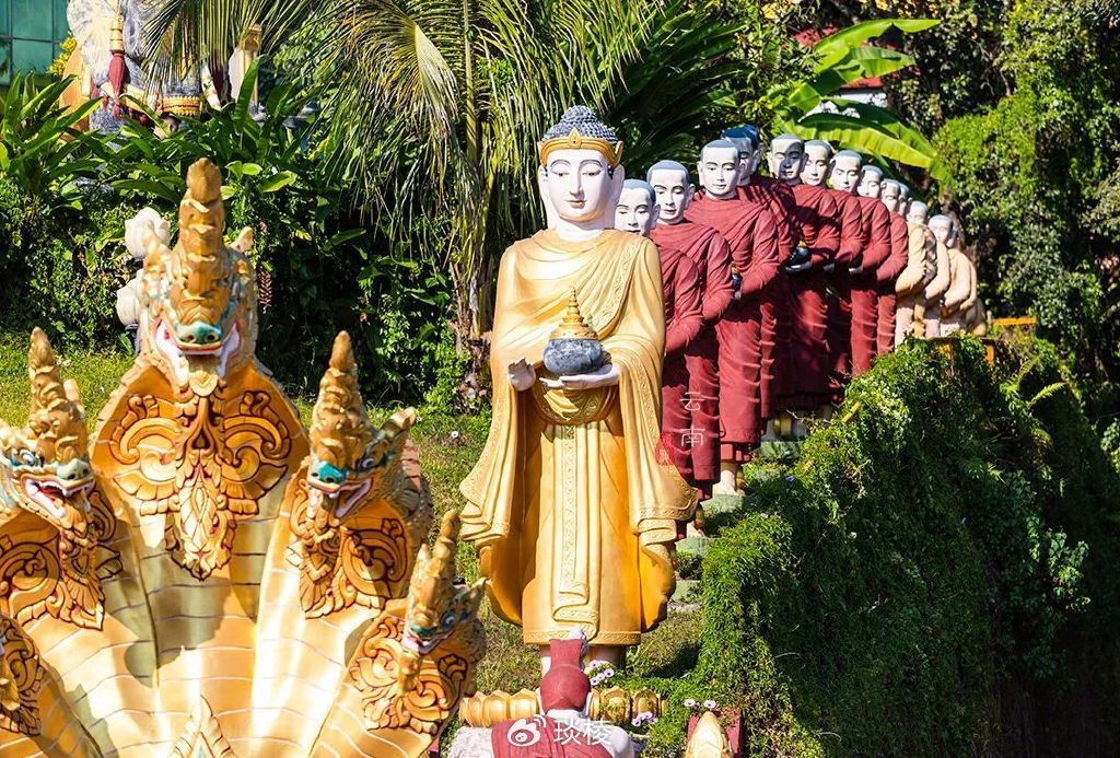 龙神旁竖立了一排僧人的雕像,手中端着金钵。为首的佛陀也是浑身金色,面露慈祥,仿佛在聆听世人的苦难。
